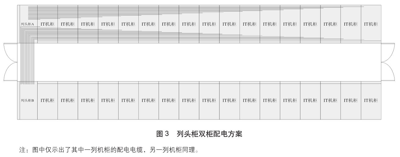 方案二的機柜布置和方案一相同,如圖3所示,但列頭柜的內部配置和配電電纜的敷設不同。具體方案是:每個封閉冷通道也設置兩個列頭柜,列頭柜A和列頭柜B,但每個列頭柜內部又分為A、B兩路,每路由不同的UPS系統引出,即列頭柜A和列頭柜B內的A路由2N雙母線系統的UPS系統A引出,列頭柜A和列頭柜B內的B路由2N雙母線系統的UPS系統B引出。