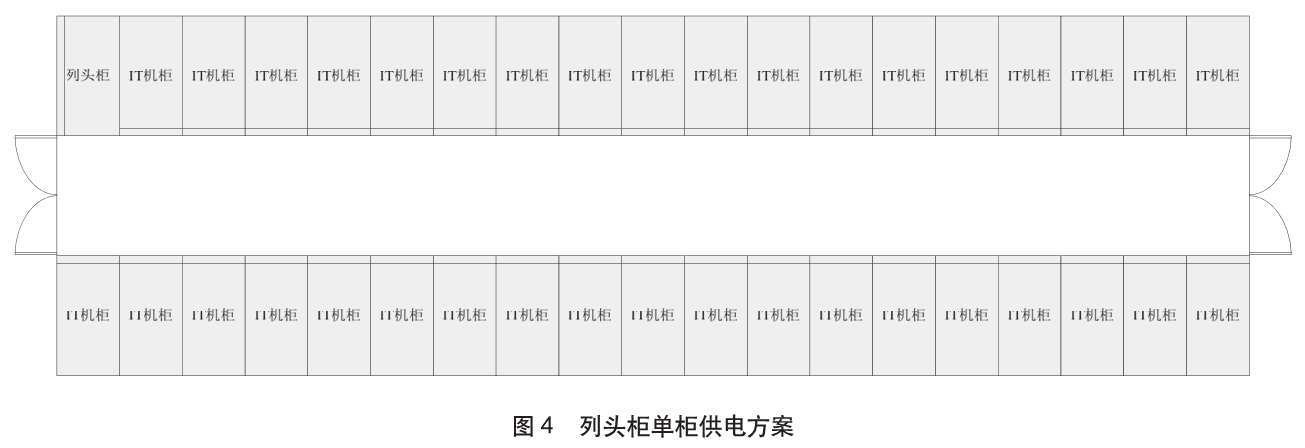 每個封閉冷通道設置兩個列頭柜,分別位于每列的頭部,每個列頭柜由不同的UPS系統引出,即列頭柜A由2N雙母線系統的UPS系統A引出,列頭柜B由2N雙母線系統的UPS系統B引出。