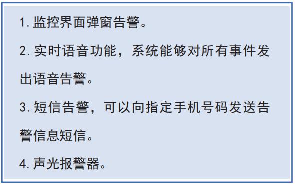 告警功能:在監控中心對環境參量超過預設值時發出視聽告警,在監控系統的人機界面上閃爍顯示,同時可以提供警示燈、報警音箱、語音、短信通知等多種告警方式。