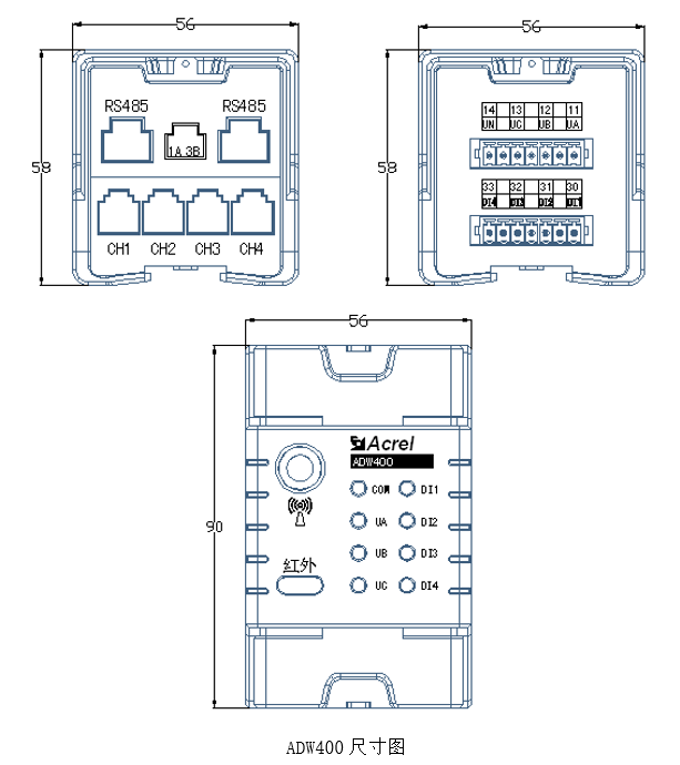 ADW400環保監測模塊主要用于計量低壓網絡的三相有功電能,同時可選擇四個回路的電流輸入,具有RS485通訊和470MHz無線通訊功能,方便用戶進行用電監測、集抄和管理。可靈活安裝于配電箱內,實現對不同區域和不同負荷的分項電能計量,統計和分析。