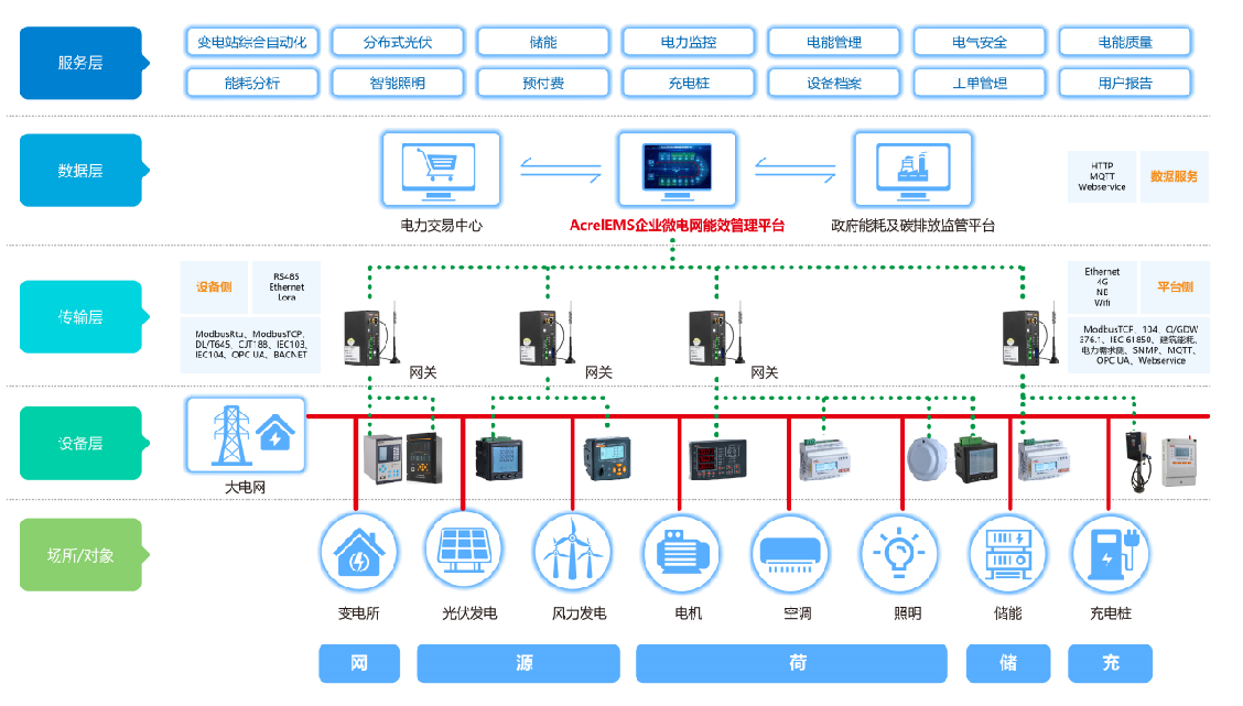 在企業(yè)微電網源、網、荷、儲、充的各個關鍵節(jié)點安裝計量和分析裝置,搭建三級計量體系,用于監(jiān)測企業(yè)能耗總量和能耗強度,從而診斷低能效環(huán)節(jié)。平臺根據最新的電網價格、用電負荷、電網調度指令等情況,調整能源使用策略,優(yōu)先使用綠色能源,使企業(yè)微電網始終高效穩(wěn)定運行,快速響應電網需求,實現(xiàn)能源互聯(lián)、信息互動,也可以把數(shù)據上傳政府能源管控平臺,例如發(fā)改委、工信部、住建部門重點用能單位能耗在線監(jiān)測平臺、電力需求側平臺、建筑能耗監(jiān)測平臺等。